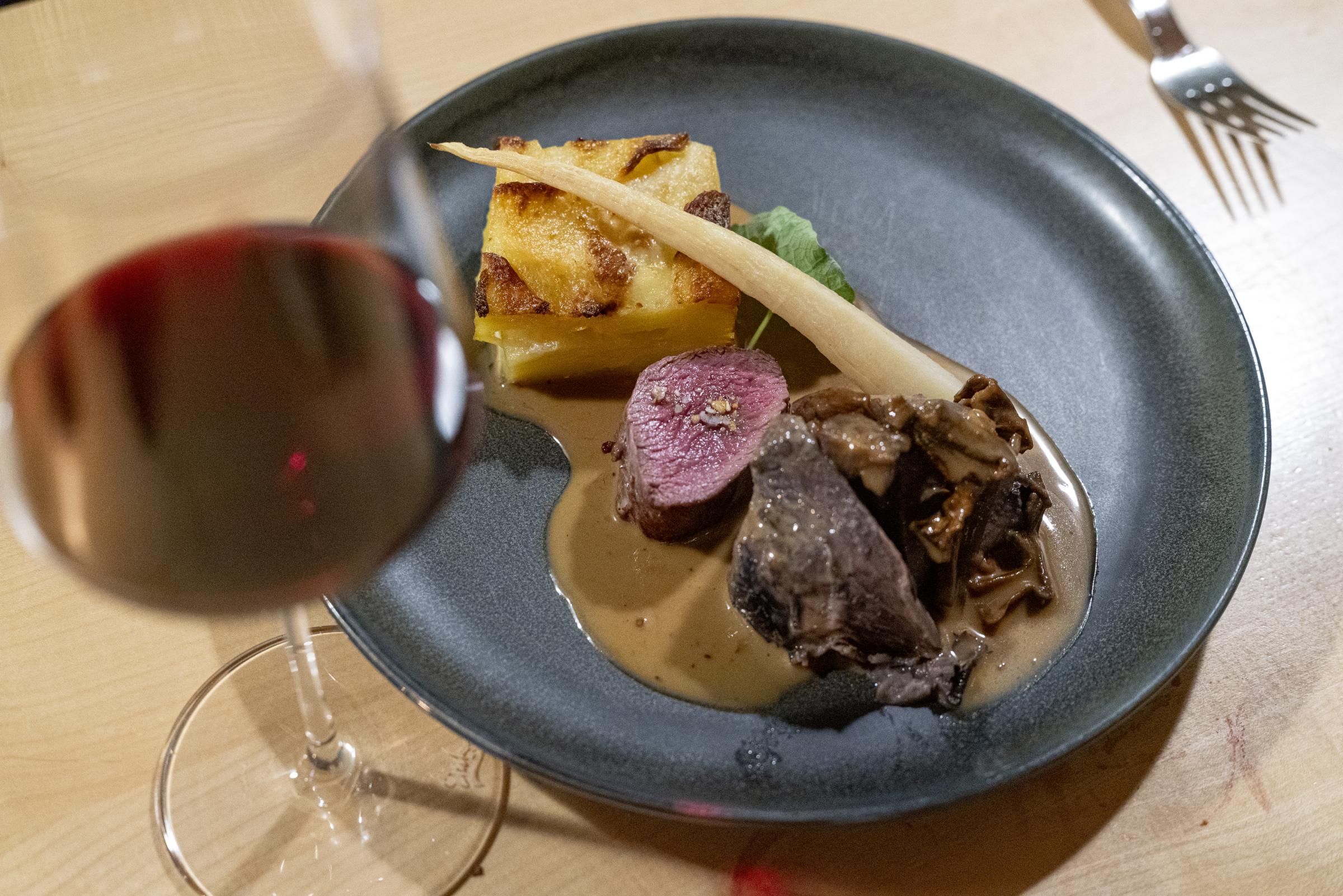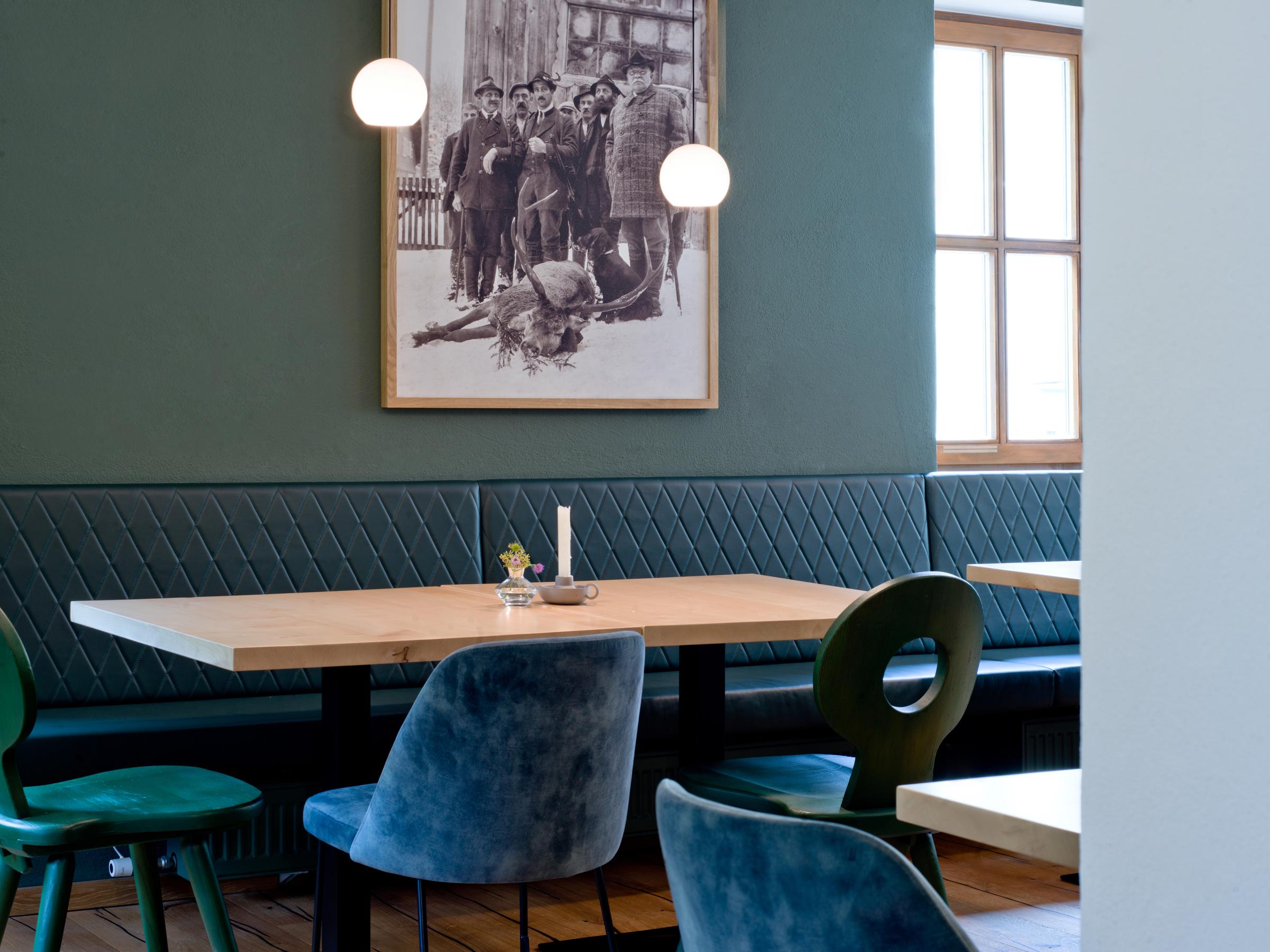 Das Wirtshaus selbst ist ebenso urig wie modern-elegant. Auf der Karte stehen bodenständige Klassiker wie Käsespätzle, Schnitzel und Wildragout neben Weiße Rüben-Carpaccio mit Birne, Walnuss und Manchego. Ein Menü, das verbindet. Hier können hungrige Wanderer deftig schmausen und gleichzeitig experimentierfreudige Genießer glücklich werden. Cordon Bleu mit Erdäpfelsalat hat dieselbe Daseinsberechtigung wie gebratener Auerer Saibling mit konfierter Pastinake, Maronenpüree und gepickelter Schalotte.